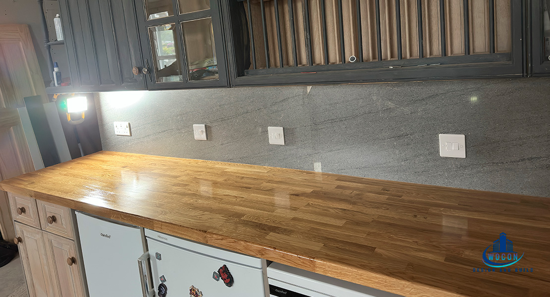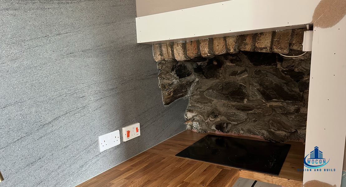 The previous kitchen and adjacent bathroom formed a cramped, impractical space. By removing the central block, we introduced a new room layout that feels more open and functional.
